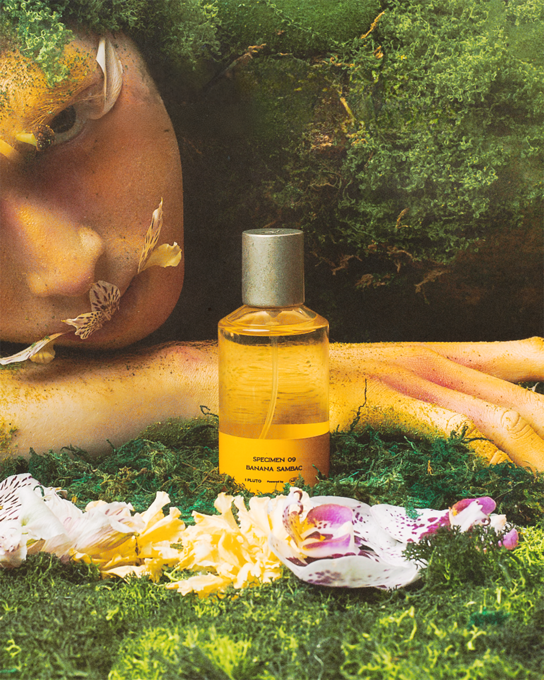 In Collaboration with Sunpride Indonesia. A scent born from transformation—where nature fuses with skin, and bloom becomes body. It opens with the sharp bite of lemon and the vegetal pulse of banana heart, cut through with the dark tang of blackcurrant. The heart shifts, lush and fleshy, with mango dripping into the narcotic white glow of gardenia and jasmine sambac.